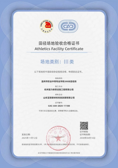 2025年11月,由杭州寶力體育設(shè)施工程有限公司承建的溫州市職業(yè)中等專業(yè)學(xué)校200米田徑場項目正式通過中國田徑協(xié)會驗收,榮獲“III類田徑場地合格證書”。這一認(rèn)證標(biāo)志著項目在場地建設(shè)標(biāo)準(zhǔn)、材料工藝及運動性能上全面符合國家級規(guī)范,成為浙江省中職學(xué)校體育設(shè)施建設(shè)的標(biāo)桿范例。