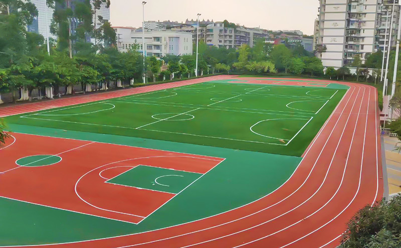 先處理基礎(chǔ)層,涂刷底膠;鋪設(shè)彈性層與加強(qiáng)層,采用顆?;旌暇郯滨ゲ牧?;面層噴涂EPDM膠粒與聚氨酯膠水,固化后劃線。工藝結(jié)合透氣型與混合型優(yōu)勢(shì),環(huán)保耐用,抗老化、防滑,施工周期短,適用于學(xué)校、體育場(chǎng)館等專業(yè)場(chǎng)地。