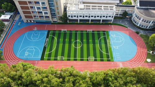2024年由杭州寶力體育設(shè)施工程有限公司承建的舟山綠城南海實驗學(xué)校400米透氣型跑道項目,采用國際標(biāo)準(zhǔn)藍色跑道搭配白色分道線;內(nèi)設(shè)綠色人工草坪足球場,標(biāo)線精準(zhǔn)。周邊配建紅綠籃球場、標(biāo)準(zhǔn)化網(wǎng)球場及生態(tài)綠化帶。