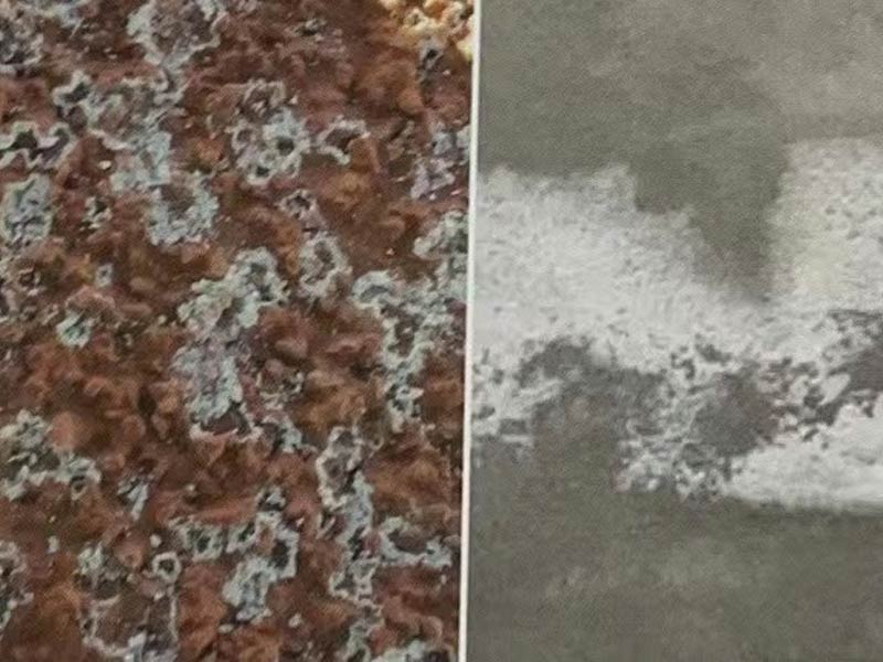 面漆甲料(固化劑)與乙料(色漿)攪拌不均勻,造成局部面漆的固化劑含量低,進而影響面漆的強度和粘接度。另外剛涂完面漆,馬上下雨也會造成硅pu脫面漆的現(xiàn)象。