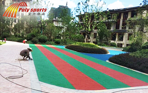 3. 施工方法:將罩面劑混合攪拌,用輥筒均勻涂布在彩色骨料層表面,保養(yǎng)一周即可使用