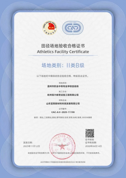 2025年11月,由杭州寶力體育設(shè)施工程有限公司承建的溫州市職業(yè)中等專業(yè)學(xué)校400米田徑場項目正式通過中國田徑協(xié)會驗收,榮獲“II類B級田徑場地合格證書”。該認證標(biāo)志著場地在建設(shè)標(biāo)準(zhǔn)、材料工藝及運動性能上全面達到國家級專業(yè)要求,可承辦全國Ⅳ級及以下田徑賽事、群眾體育競賽及業(yè)余運動員等級達標(biāo)活動,成為浙江省中職學(xué)校體育設(shè)施建設(shè)的標(biāo)桿范例。