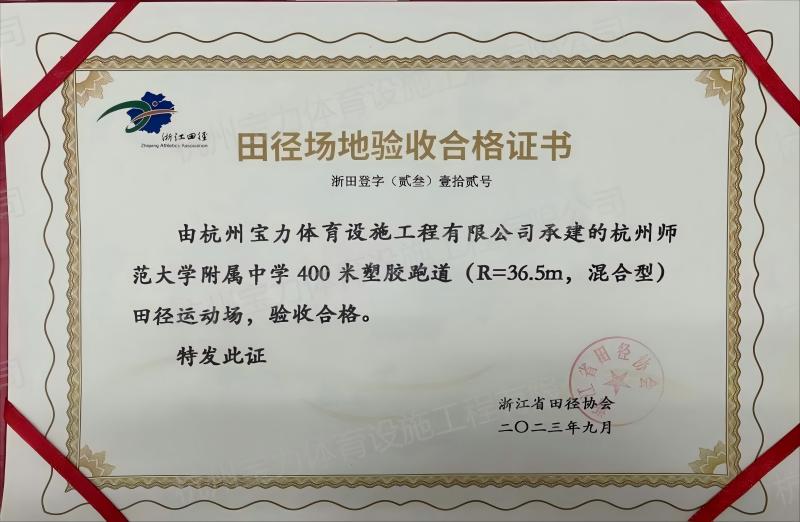 2023年由杭州寶力體育設(shè)施工程有限公司承建的杭州師范大學(xué)附屬中學(xué)400米塑膠跑道(R=36.5m,混合型)田徑運動場,經(jīng)中國田徑場協(xié)會驗收合格。
